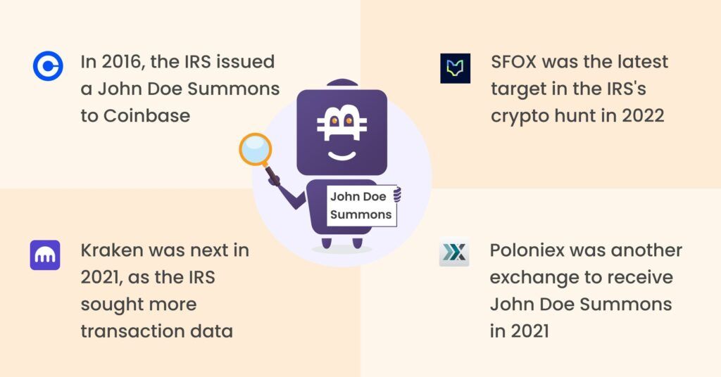 • Major crypto exchanges under scrutiny: Coinbase, Kraken, Circle, Poloniex, and SFOX were issued John Doe Summons by the IRS between 2016 and 2022.